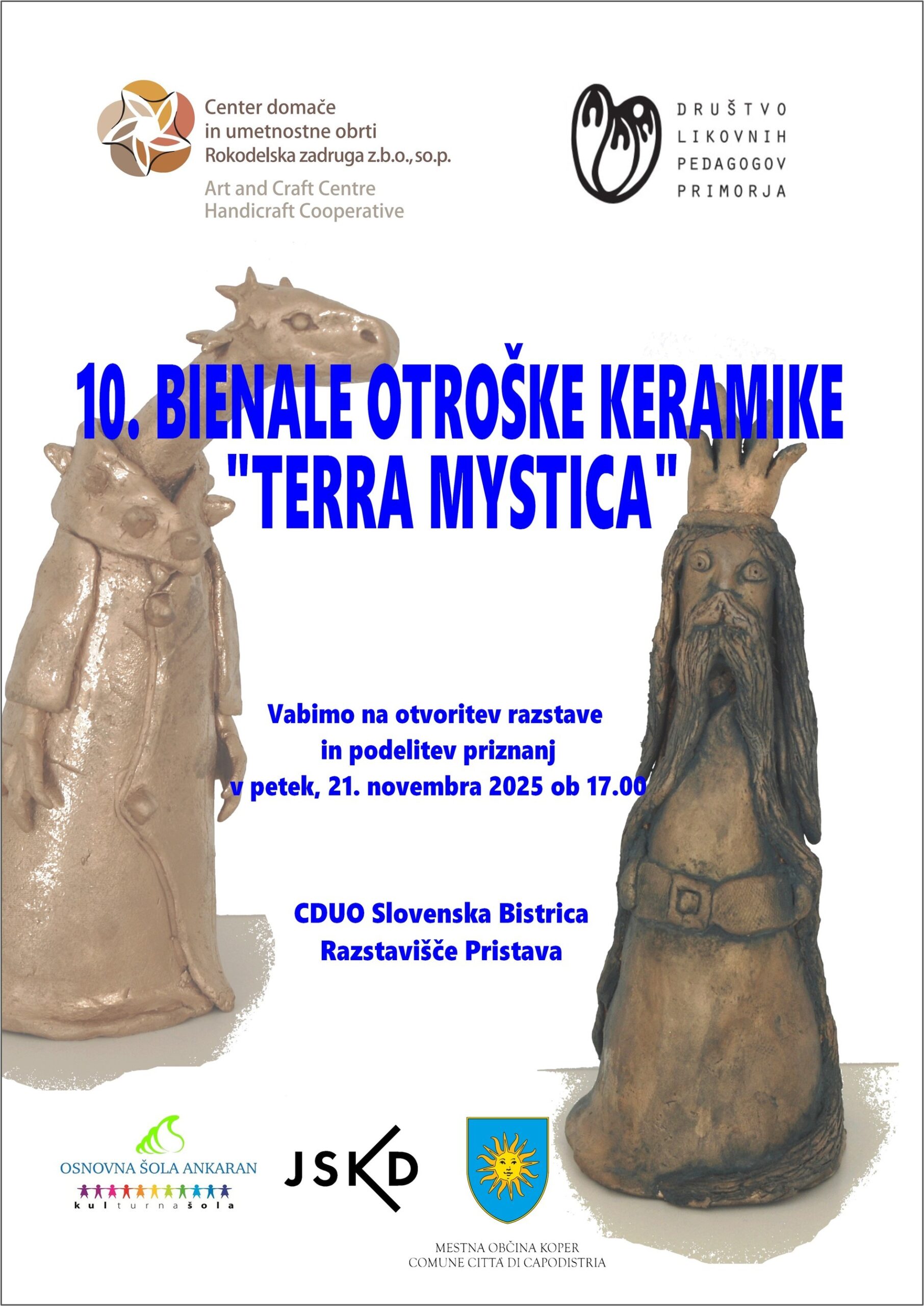 Center domače in umetnostne obrti vabi na odprtje razstave 10. bienala otroške keramike Terra mystica, ki ga v sodelovanju z Društvom likovnih pedagogov Primorja pripravljajo v razstavišču Pristava v Centru domače in umetnostne obrti Slovenska Bistrica v petek, 21. novembra 2025, ob 17. uri.