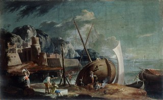FOTO: F.I. Flurer: Morsko obrežje z ladjo v popravilu, olje na platnu, hrani Narodna galerija Ljubljana (Grajski stolpec)