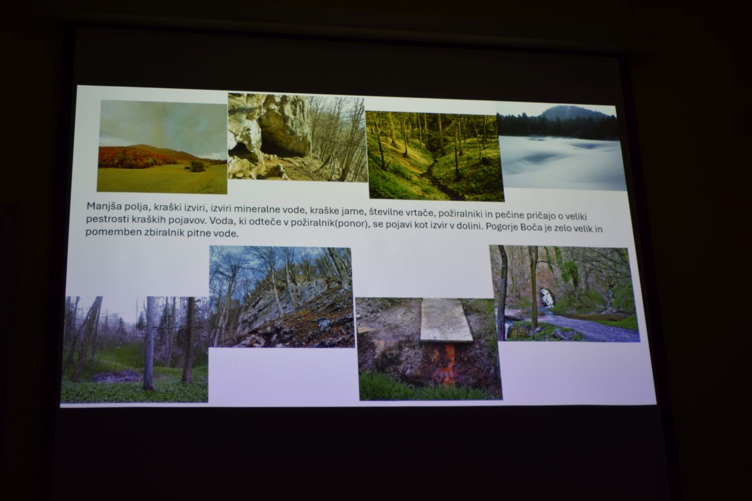 Predavatelj je v sliki in besedi predstavil manjša kraška polja, izvire (tudi izvire mineralne vode), kraške jame, vrtače in požiralnike ter opozoril, da je pogorje Boča pomemben zbiralnik pitne vode. Ob tem je prikazal tudi za Boč značilne drevesne in živalske vrste ter izpostavil pomen ohranjanja habitatov.