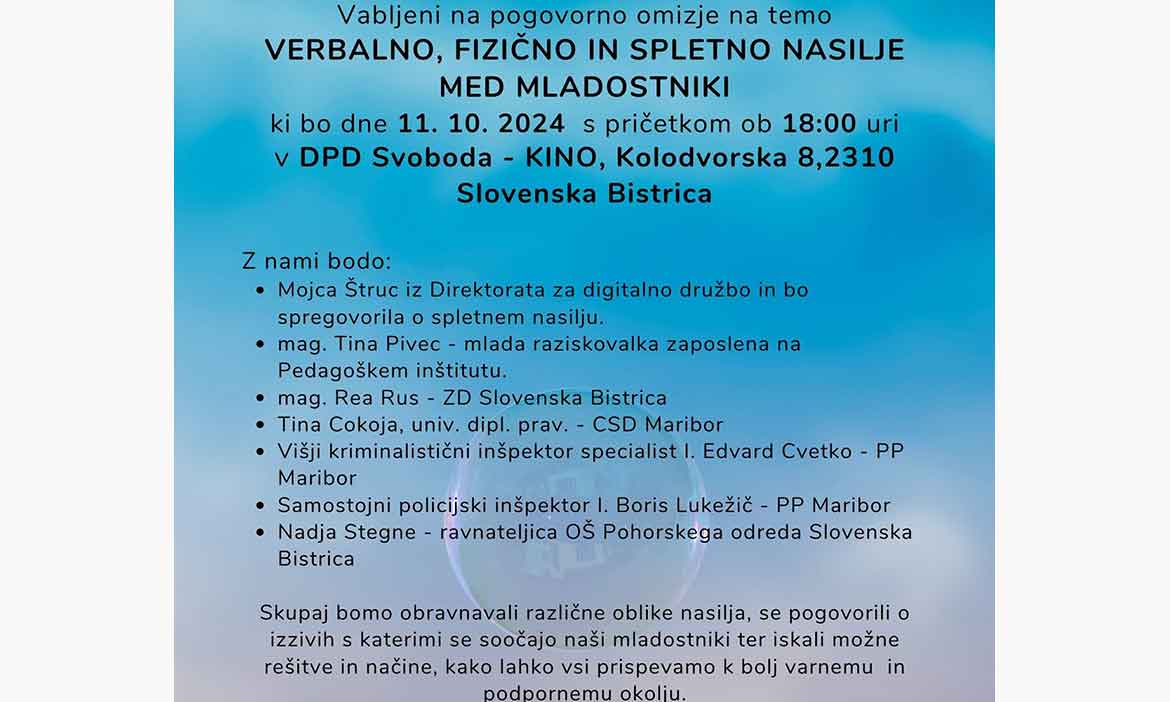 Tema nasilja med mladimi je v zadnjih letih vse bolj prisotna in nas kot skupnost zadeva na različnih ravneh. Na omizju bomo skupaj obravnavali različne oblike nasilja, se pogovorili o izzivih, s katerimi se soočajo naši mladi, ter iskali možne rešitve in načine, kako lahko vsi prispevamo k bolj varnemu in podpornemu okolju.