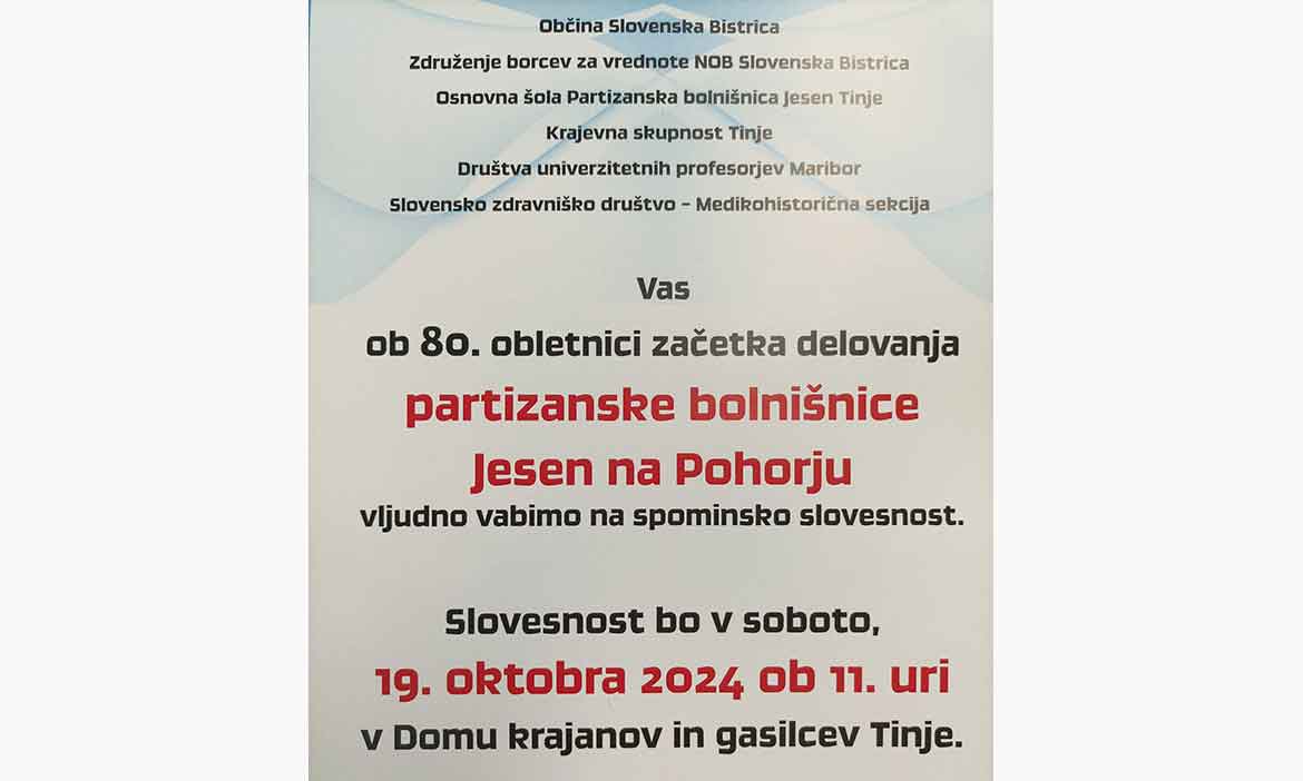 Ob 80. obletnici začetka delovanja PARTIZANSKE BOLNIŠNICE JESEN NA POHORJU. Vljudno vabljeni na slovesnost, ki bo v soboto 19. oktobra 2024 ob 11. uri v Domu krajanov in gasilcev Tinje.