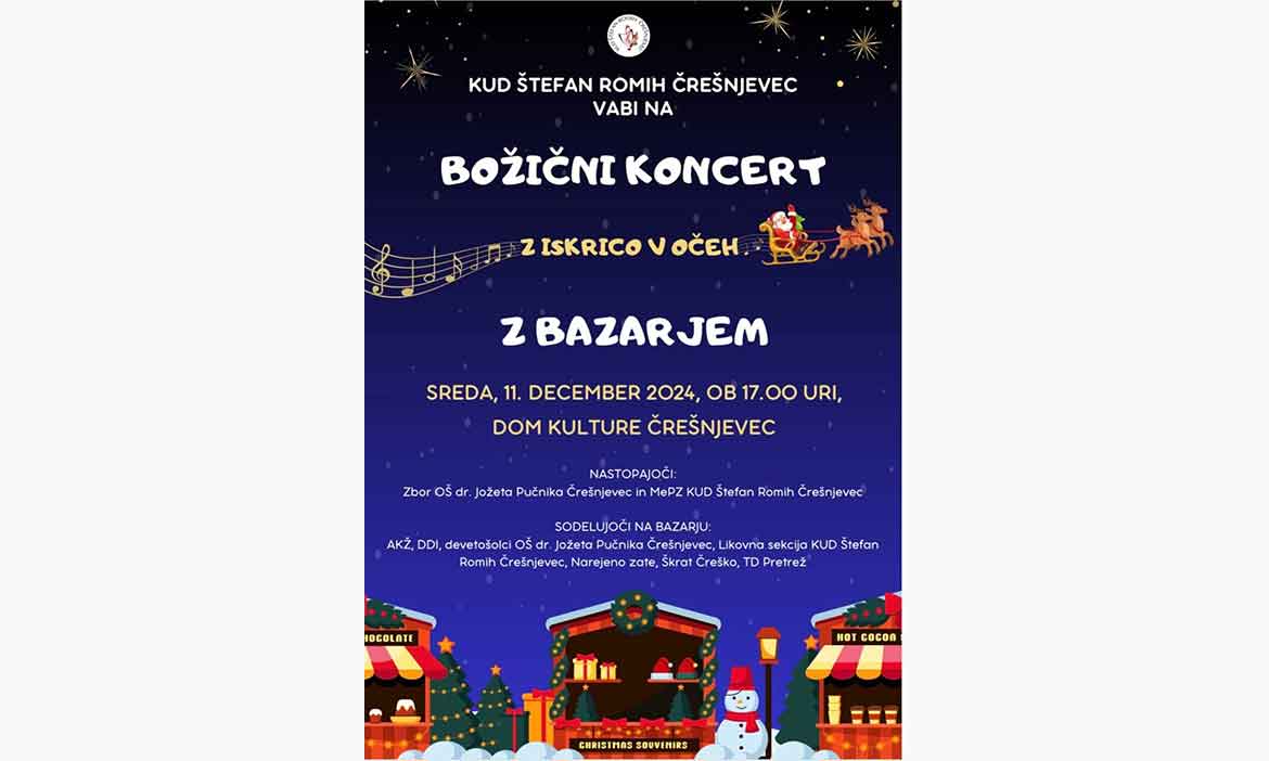 In, ker so prazniki namenjeni druženju se želimo z vami podružiti tudi mi. Zato vas 11. decembra 2024 vabimo v naš kulturni dom, kjer se bomo ob prazničnem ambientu in ob zvokih božičnih skladb veselili prihajajočih praznikov skupaj z vami.
