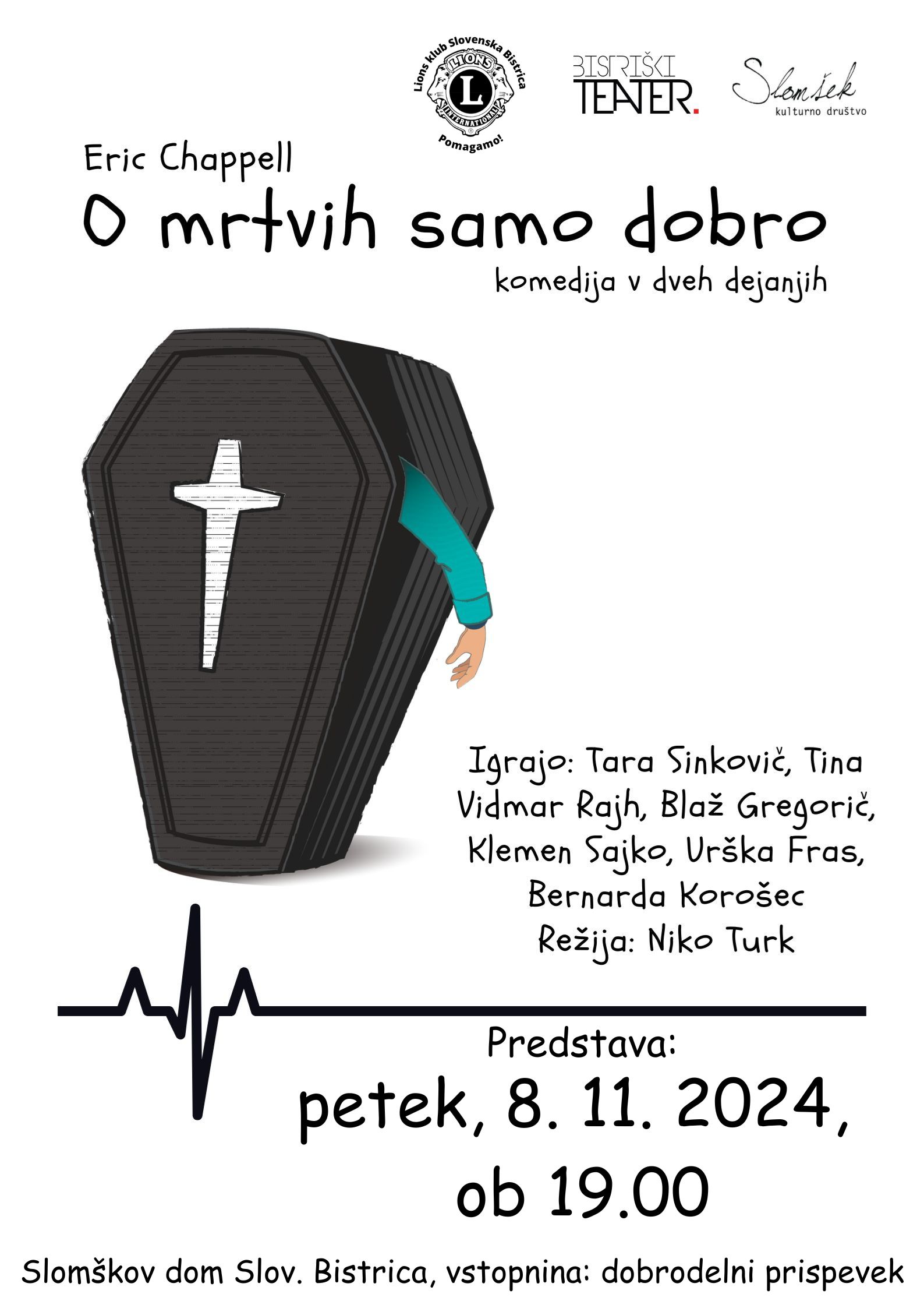 Lions klub Slovenska Bistrica vabi na dobrodelno predstavo “O mrtvih samo dobro” v petek, 8. novembra 2024, ob 19:00. Pridružite se nam in podprite obdarovanje starejših in otrok iz socialno šibkejših okolij v prazničnem decembru.