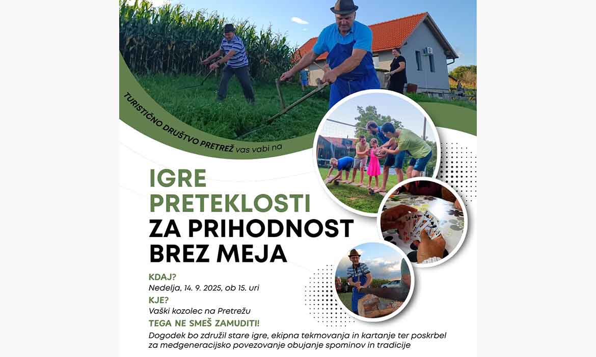 Vabljeni na dogodek »Igre preteklosti za prihodnost brez meja«, ki bo v nedeljo, 14. septembra 2025, ob 15. uri pri vaškem kozolcu na Pretrežu.