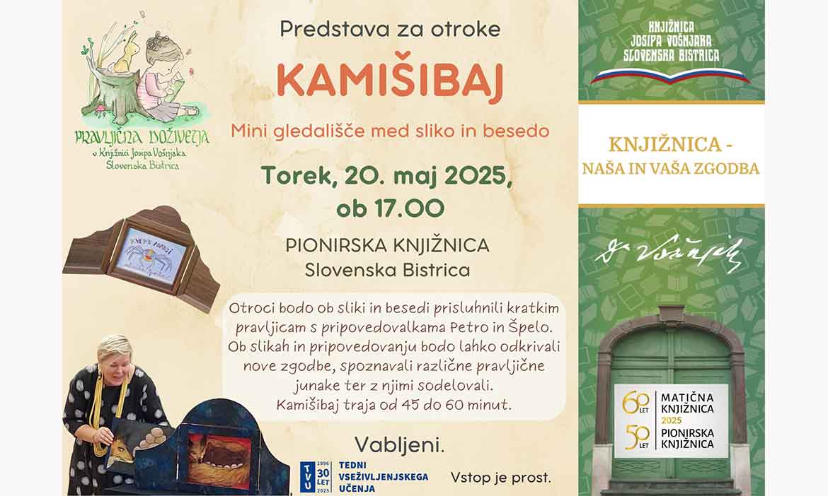 Otroci bodo ob sliki in besedi prisluhnili kratkim pravljicam s pripovedovalkama Petro in Špelo. Ob slikah in pripovedovanju bodo lahko odkrivali nove zgodbe, spoznavali različne pravljične junake ter z njimi sodelovali. Kamišibaj traja od 45 do 60 minut.