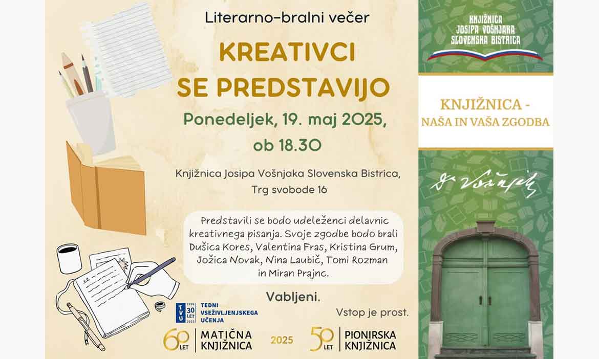 V Knjižnici Josipa Vošnjaka Slovenska Bistrica že drugo leto zapored izvajamo delavnice kreativnega pisanja. Člani, ki se delavnic redno udeležujejo, so v tem času ustvarili nemalo kvalitetnih kratkih zgodb – življenjskih, ljubezenskih, kriminalnih, noir … In ker v knjižnici menimo, da so zgodbe takšne, da bi jih ‘kreativci’ morali predstaviti širši javnosti, smo se odločili, da se vam predstavijo v tednu, ko naša knjižnica praznuje.