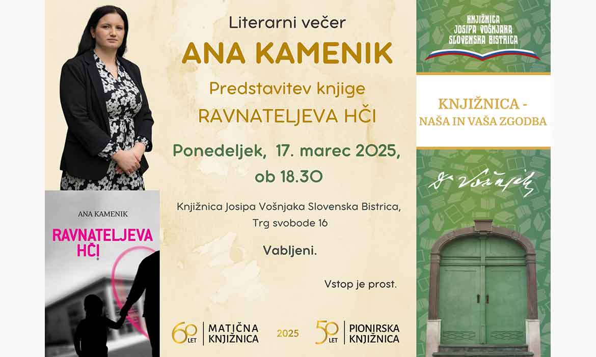 V ponedeljek, 17. marca 2025, ob 18:30, vljudno vabljeni na literarni večer Ane Kamenik, ki bo predstavila knjigo Ravnateljeva hči.