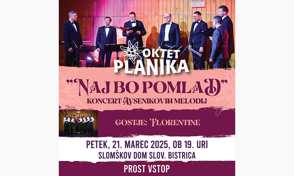 v imenu Okteta Planika vas lepo vabim na koncert na prvi pomladni dan. Koncert prirejamo z naslovom Naj bo pomlad in se bo odvil v Slomškovem domu v Slovenski Bistrici v petek, 21. 3. 2025, ob 19. uri. Vstop je prost. Gostje bodo Vokalna skupina Florentine iz Selnice ob Dravi.