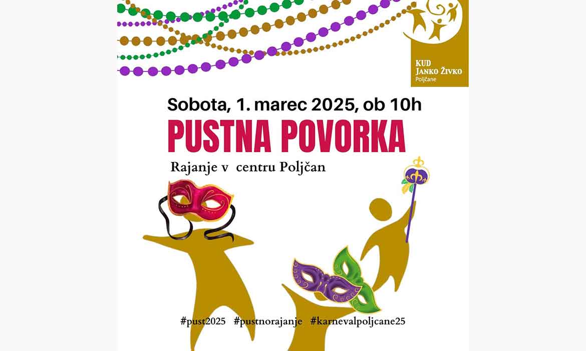 Pridružite se nam v svojih najbolj domiselnih maskah in skupaj ustvarimo pravo pustno rajanje! Veseli bomo tako posameznih mask kot skupinskih pustnih likov. Obenem vabimo vse občane, da pridejo občudovat pustne mojstrovine in se prepustijo živahnemu vzdušju.