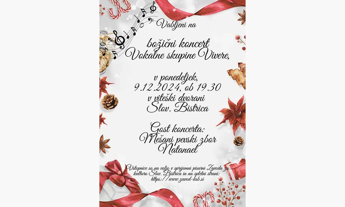 Vokalna skupina Vivere vabi na božični koncert, ki bo v ponedeljek, 9. 12. 2024, ob 19.30 v viteški dvorani gradu v Slovenski Bistrici.