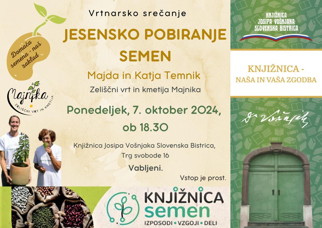 Na prvem jesenskem srečanju si boste lahko med drugim pogledali, kdaj je najprimernejši čas za pobirnanje semen določenih vrst zelenjave. Pokazali vam bodo, kako jih očistiti, in dali napotke, kako jih pravilno skladiščiti. Predavali bosta Katja in Majda Temnik iz zeliščnega vrta in kmetija Majnika, ki je partner v projektu Knjižnica semen. Vrtnarska srečanja bodo potekala vsak prvi ponedeljek v mesecu od oktobra do maja.