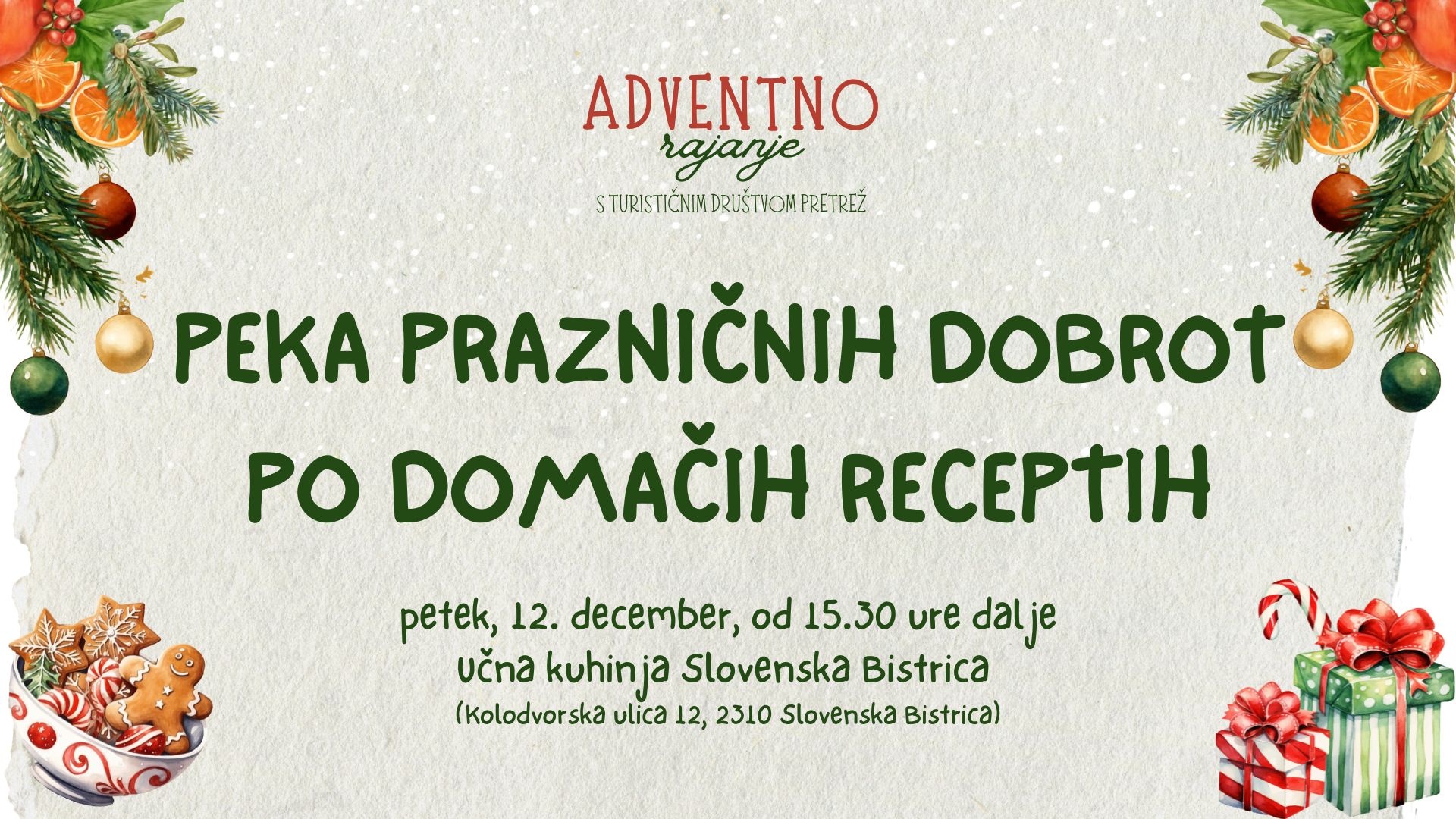 Turistično društvo Pretrež vabi, da v petek, 12. decembra 2025, od 15.30 naprej na praznično obarvan popoldan v učni kuhinji Slovenska Bistrica, kjer boste skupaj pripravljali domače dobrote, ki polepšajo adventni čas.