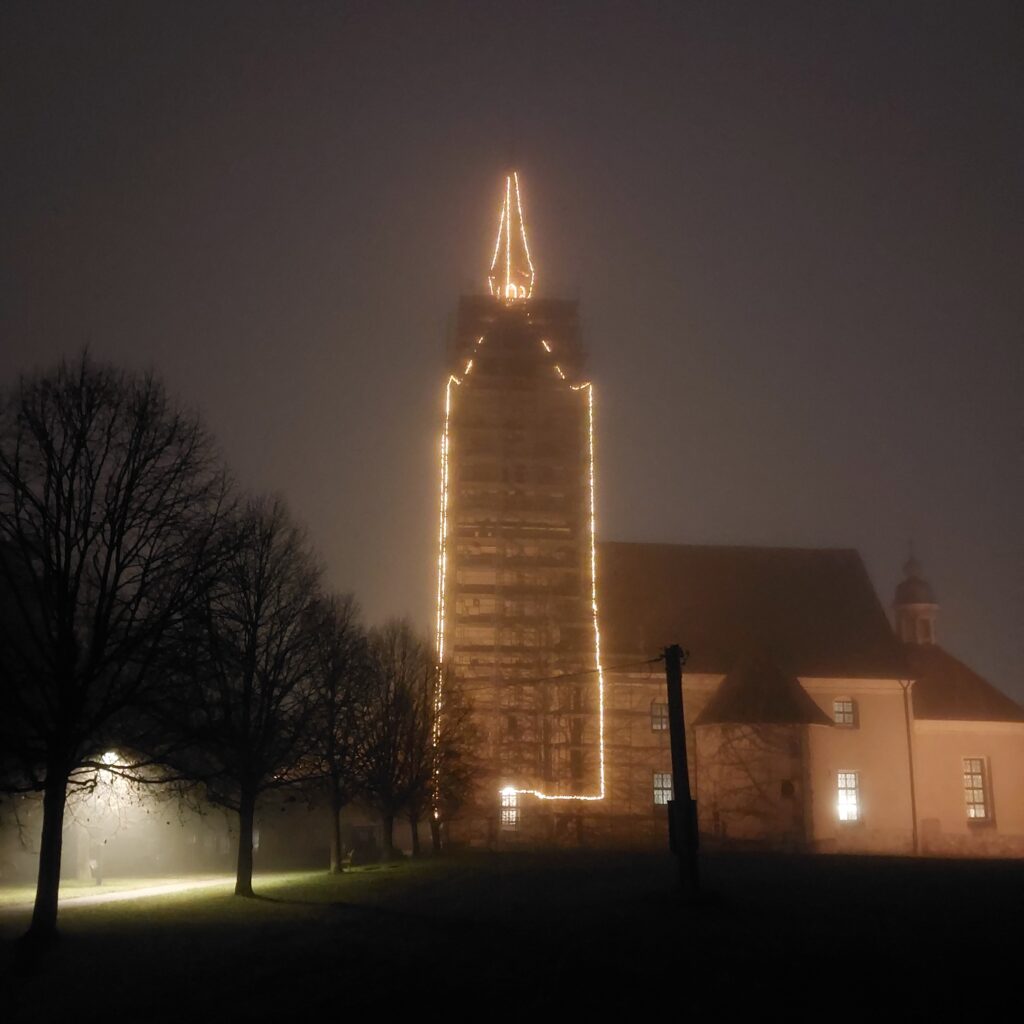 Želja je bila, da bi jih prižgali že na prvo adventno nedeljo, a se je datum prvega prižiga malce zamaknil zaradi nedokončanih faz dela na konici in strehi. Je pa bilo veselje toliko večje, ko je skoraj 300 metrov lučk le zažarelo tik pred četrto adventno nedeljo. Njihov obris prikazuje veličastno podobo mogočnega zvonika, ki je zdaj res dobro viden tudi v nočnem času in ga lahko ljudje opazijo že na daleč. »Res sem vesel številnih pozitivnih odzivov in lepih presenečenj, ki jih je ta osvetlitev zvonika sprožila,« pravi župnik Jani Družovec. »Lučke bodo lepoto in veličino našega zvonika poudarjale v letošnjem božičnem času, morda pa tudi po končani obnovi,« je še skrivnostno dodal.