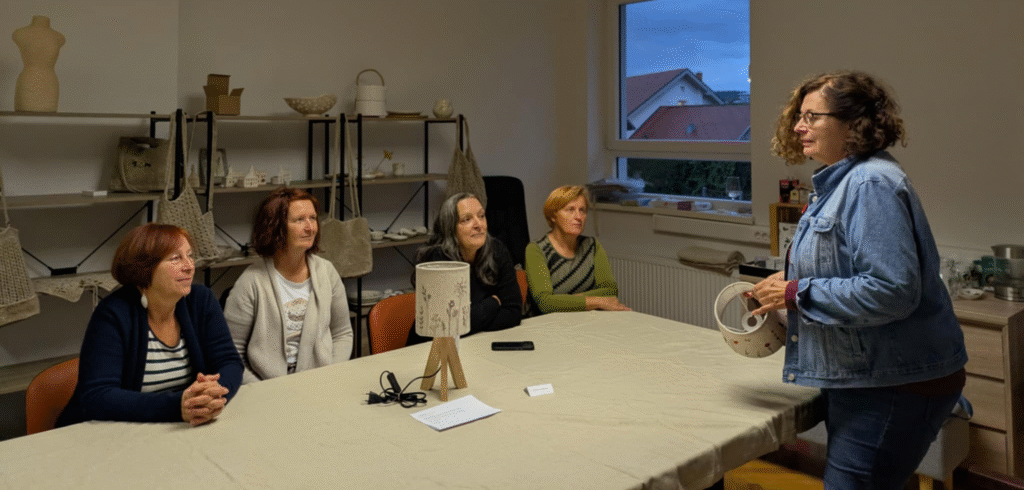 V prostorih Društva Kreativna akademija je v ponedeljek, 29. septembra, priznana rokodelka Stanislava Pernat, ustvarjalka pod znamko Hvala za rože, predstavila svoj novi rokodelski izdelek – ročno vezeno namizno svetilko »Nit svetlobe«, ki je nastala v okviru pilotnega poziva NVO Rokodelci 2025.